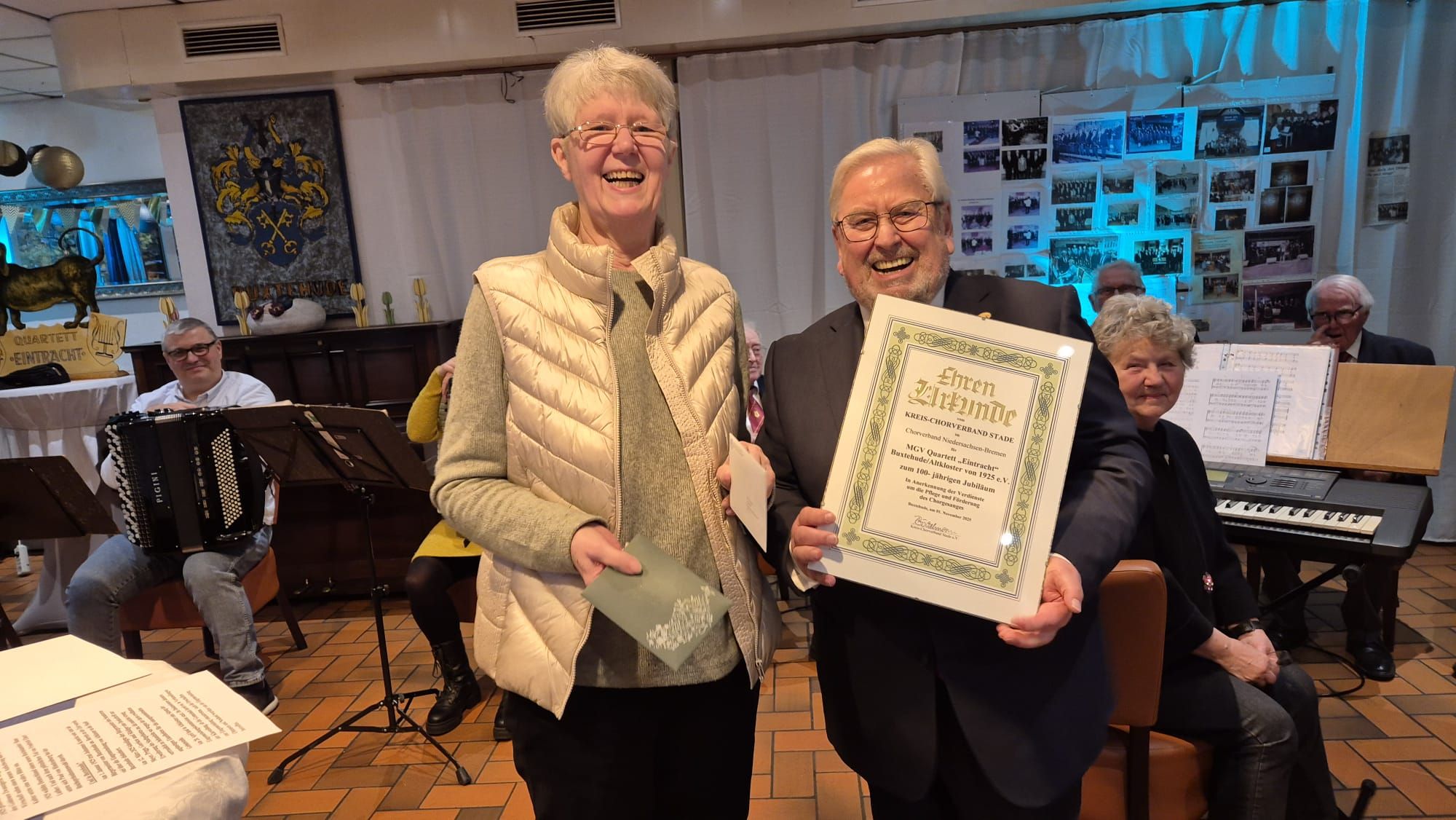 Damit hatte er nicht gerechnet. Hans-Ulrich Angerstein wurde für 25 Jahre aktives Singen mit einer Urkunde und Anstecker in Silber geehrt.